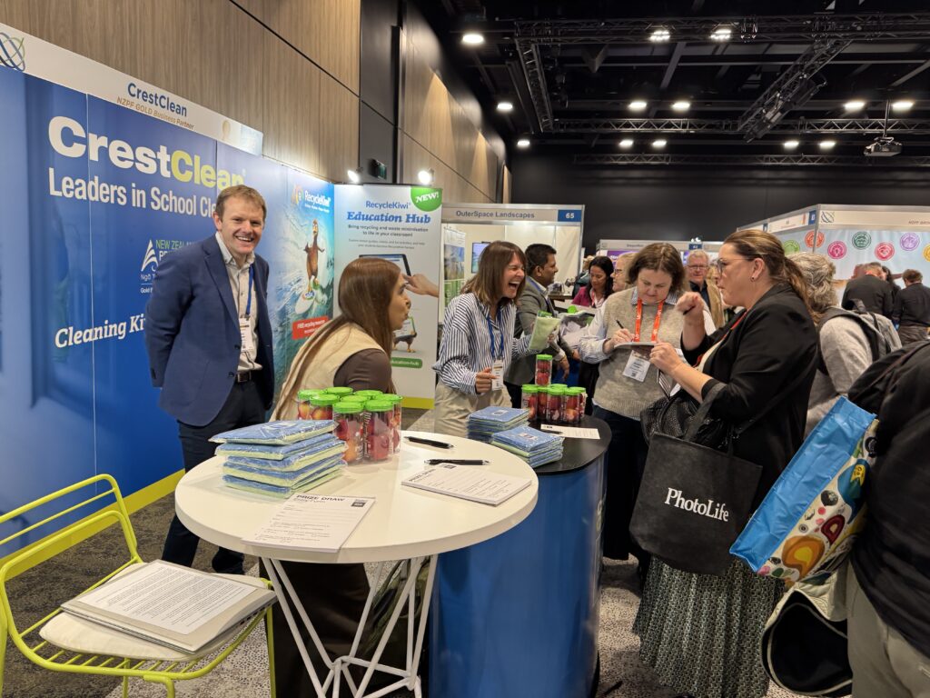 CrestClean’s booth stood out with its vibrant colours and engaging design. Featuring RecycleKiwi® branding, the Education Hub display, school respect posters, and CrestClean’s crisp school cleaning branding, the space was a lively hub throughout the conference.