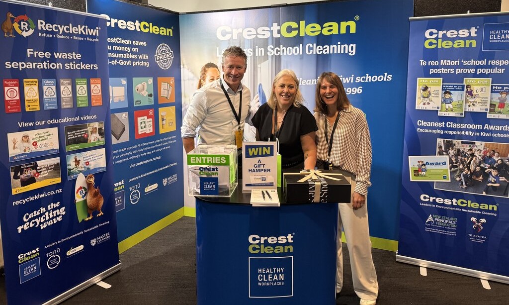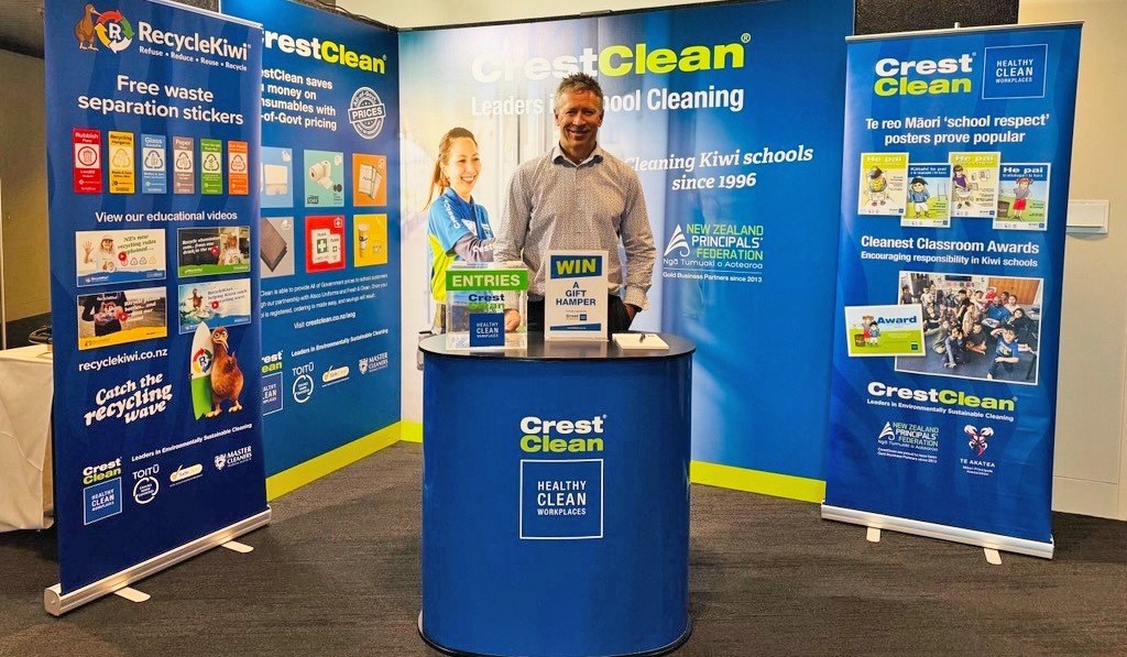 Wellington Regional Managers Adrian and Kylie Cashmore set up a vibrant and welcoming CrestClean booth and enjoyed catching up with principals and school staff from across the region. With around 76 schools attending – including 25 current CrestClean customers – it was a great opportunity to reconnect with familiar faces and meet new people.