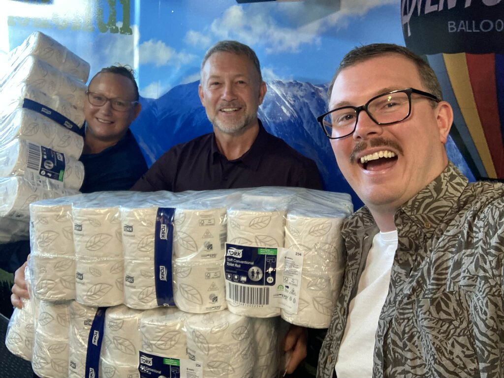 Always happy to support a good cause, Rob jumped straight on it. He rang his Alsco representative, Rachael O’Reilly, who reached out to their supplier, Tork. Amazingly, Tork and Alsco worked together to donate 20 mega packs of New Zealand made Tork Advanced Soft Conventional toilet paper to Hokonui radio station.